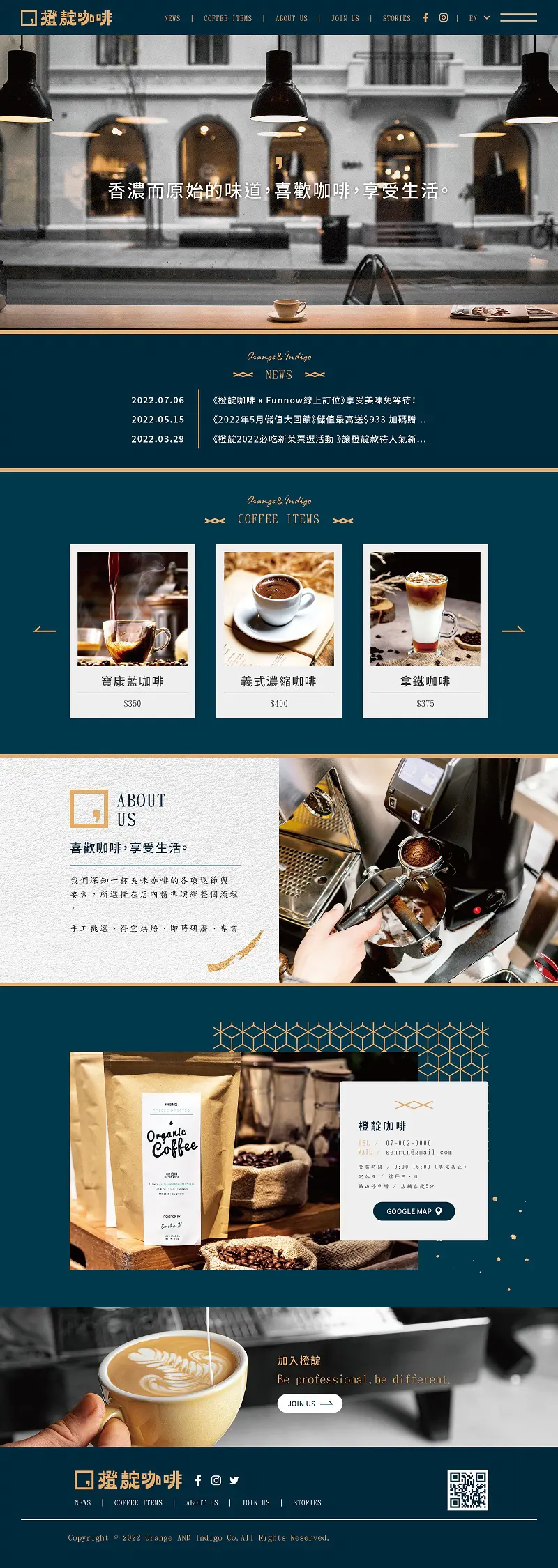 從「關於我們」到「咖啡品項」,整個網站的節奏如同沖煮的過程——穩定、精準、富有節奏。龐果設計希望讓使用者不只是瀏覽產品,而是走進一間有故事的咖啡館,體驗「專業」與「不同」的細節。橙靛咖啡的網站不追求華麗,而是透過簡單設計與真實情感,讓人感受到咖啡帶來的溫度與生活的美好。