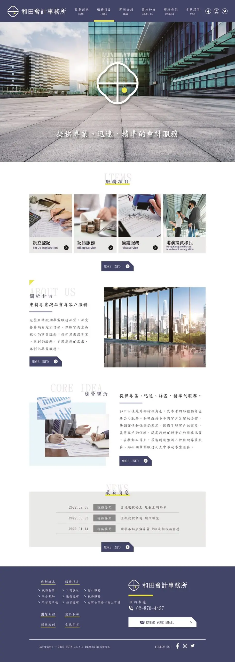 網站架構清晰,首頁依序呈現服務項目、品牌理念與聯絡資訊。四大服務以實景影像對應內容,讓使用者直覺理解「設立登記、記帳報稅、簽證輔導、投資移民」等項目,強化信任與實務導向。文字採簡潔有力的敘述,呼應會計師事務所「精準、快速、詳盡」的服務特質。