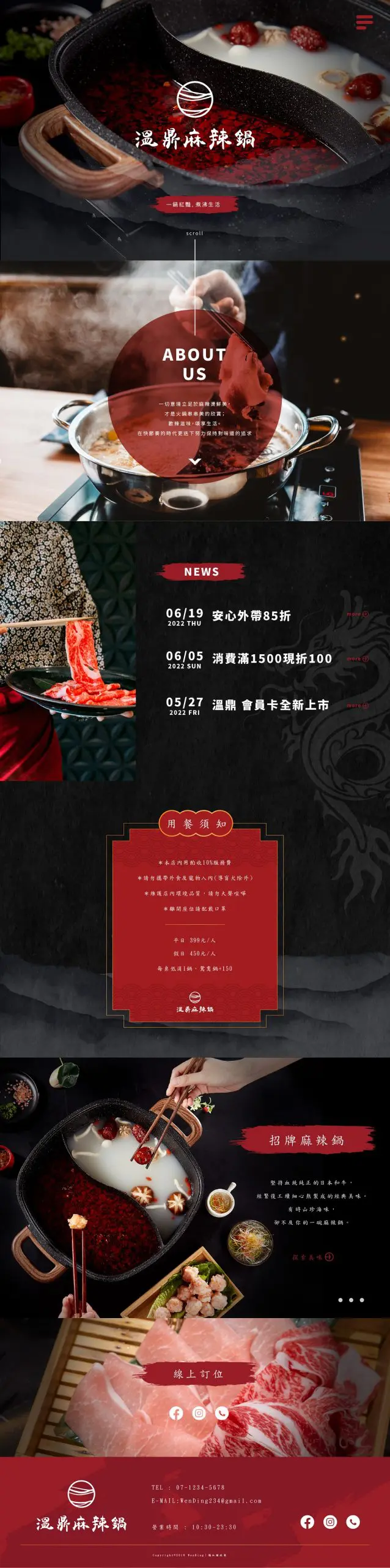 網站設計延續這份精神,以紅與黑為主要色彩,象徵熱辣與沉穩。首頁大圖展現一鍋鴛鴦鍋,紅湯與白湯相對,視覺上既是味覺的想像,也是生活平衡的隱喻。標語「一鼎熱情,沸騰生活」成為核心訊息,強調麻辣鍋不只是料理,更是一種熱氣騰騰的生活態度。