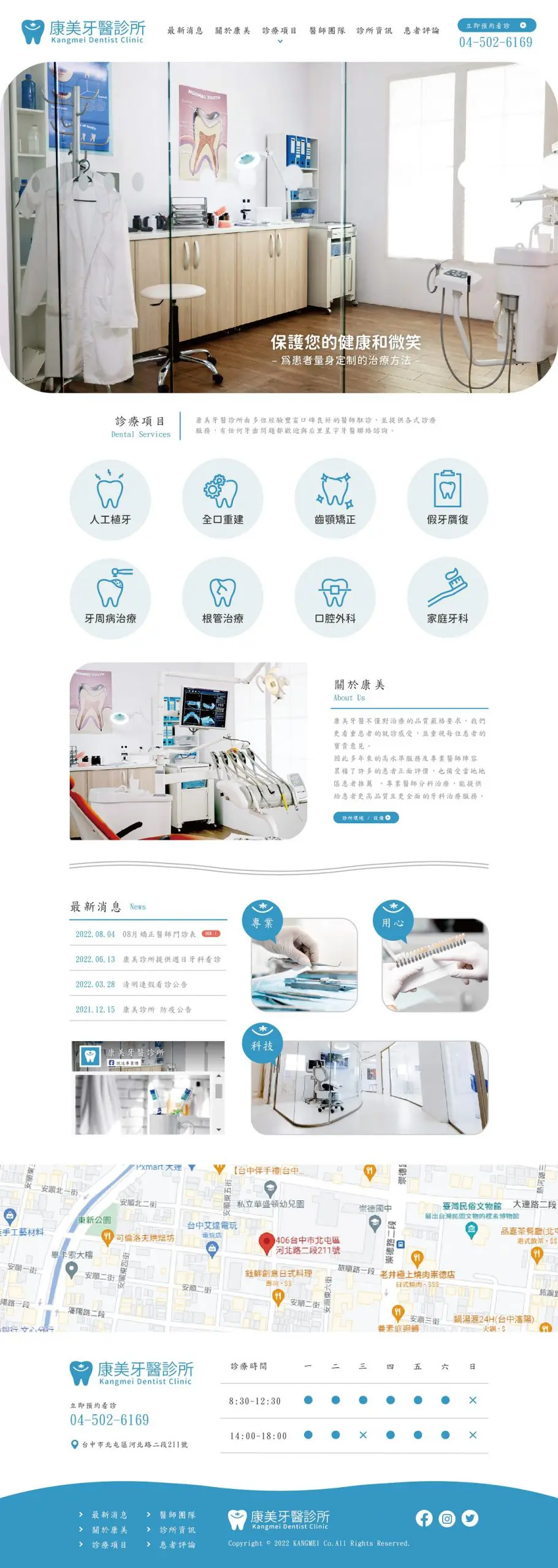 首頁以「保護您的健康和微笑」作為主標語,簡單卻直抵人心,搭配真實診間影像,傳遞誠懇與信任。網站結構清晰,診療項目以圖示與關鍵字呈現,減少醫學術語的壓迫感,使資訊易於理解。從「關於康美」到「最新消息」,每一頁都以貼近生活的語氣,建立品牌與病人間的溝通與陪伴。